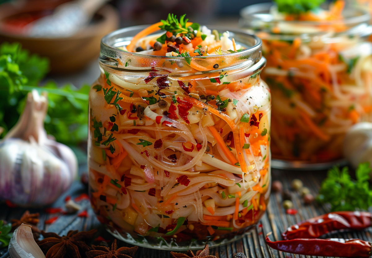 Ингредиенты потребуются следующие: капуста белокочанная — 2 кг, морковь — 2 штуки, чеснок — 3–4 зубчика, имбирь — около 5 см, перец чили — 2–3 стручка. Для приготовления маринада подготовьте воду — 1 литр, уксус яблочный (6%) — 200 миллилитров, сахар — 150 граммов, соль — 80 граммов, соевый соус — 3 столовые ложки, бадьян — две звездочки. Нашинкуйте капусту соломкой. Морковь измельчите на терке, чеснок — пластинками, имбирь — мелкими кусочками. Перец чили нарежьте тонкими колечками.
