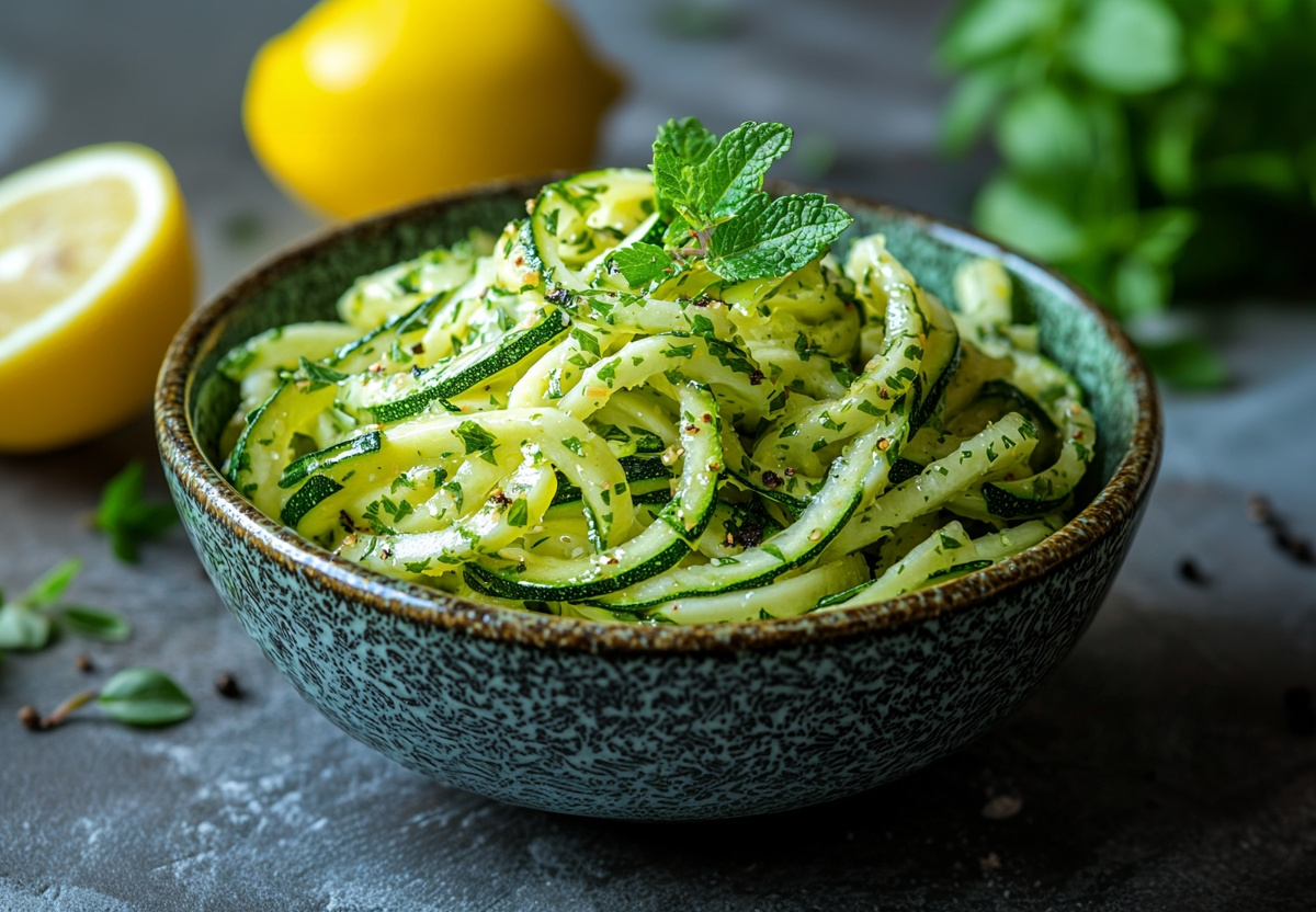 У кабачков отрезать хвостик и нашинковать прямо с кожурой и сердцевиной на терке для корейских салатов. Залить соломку маринадом, перемешать, накрыть крышкой и убрать в прохладное место на полчаса. Маринованные кабачки по-корейски быстрого приготовления подают в неглубоких пиалах, посыпав кунжутом.