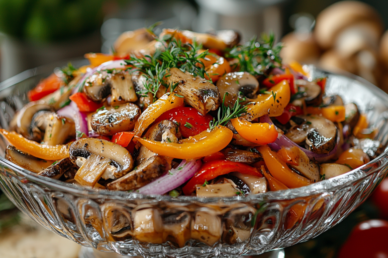 Вкус этих грибов — невероятно насыщенный и сбалансированный: нежные шампиньоны впитывают пикантный соевый маринад с кислинкой лимона и остротой чеснока, а хрустящие овощи добавляют свежести. Это блюдо станет вашей коронной закуской!