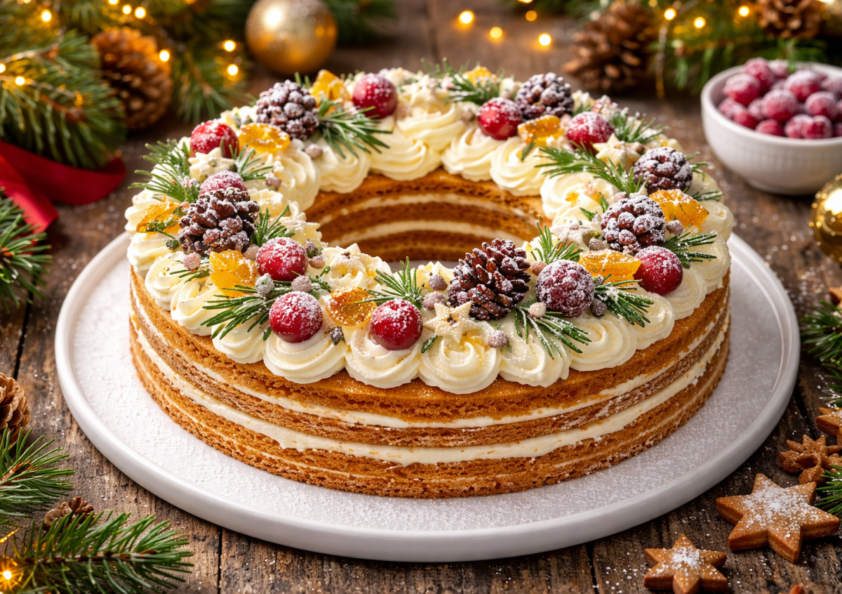 Этот медовик в форме венка сразу создает праздничное настроение. Тонкие медовые коржи, пропитанные воздушным сметанным кремом, получаются мягкими, ароматными и буквально тают во рту. Такой торт не только украшает новогодний стол, но и становится его главным десертом — проверено.
