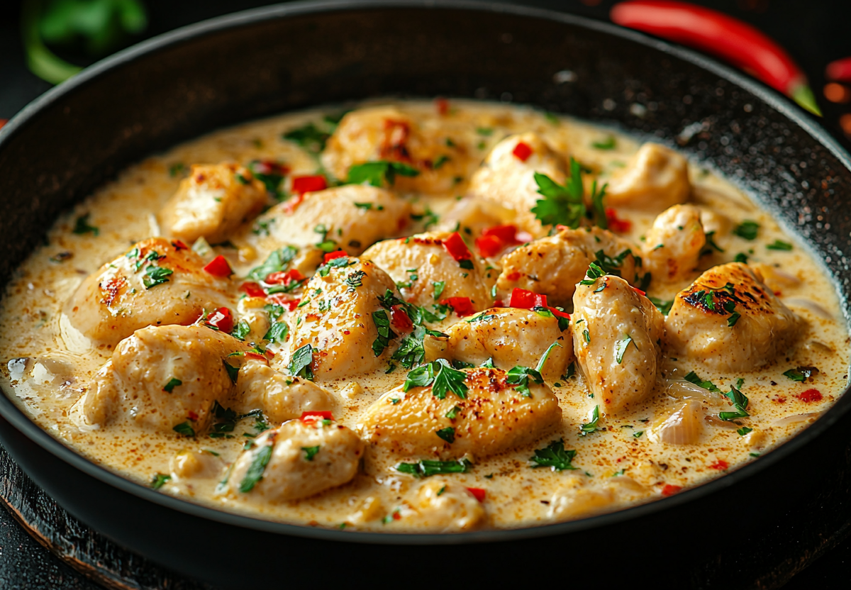 Замаринуйте 400 г куриного филе в смеси 100 мл кокосового молока, 1 ст. л. тертого имбиря и сока лайма (30 мин). Обжарьте 2 мин до корочки, затем тушите под крышкой 10 мин в соусе из маринада + 50 мл воды, 1 ч. л. меда и 2 зубчиков чеснока. Секрет сочности: не переворачивайте чаще одного раза! Кокосово-имбирный соус создаст бархатистую текстуру, а мед добавит карамельные ноты. Калорийность порции (200 г) — 210 ккал (35 г белка!).