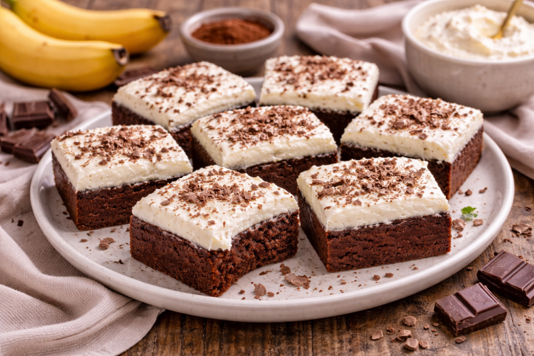 Бананы разминают вилкой до состояния пюре. Добавляют яйца, какао, разрыхлитель и сахарозаменитель, хорошо перемешивают до однородной массы. Тесто выливают в форму, застеленную пергаментом. Выпекают при 200 °C около 15–20 минут до упругой текстуры. Готовый брауни немного остужают, сверху намазывают смесь мягкого творога с сахарозаменителем. Получается нежный, шоколадный и очень уютный десерт — без лишних калорий и магазинных соблазнов.