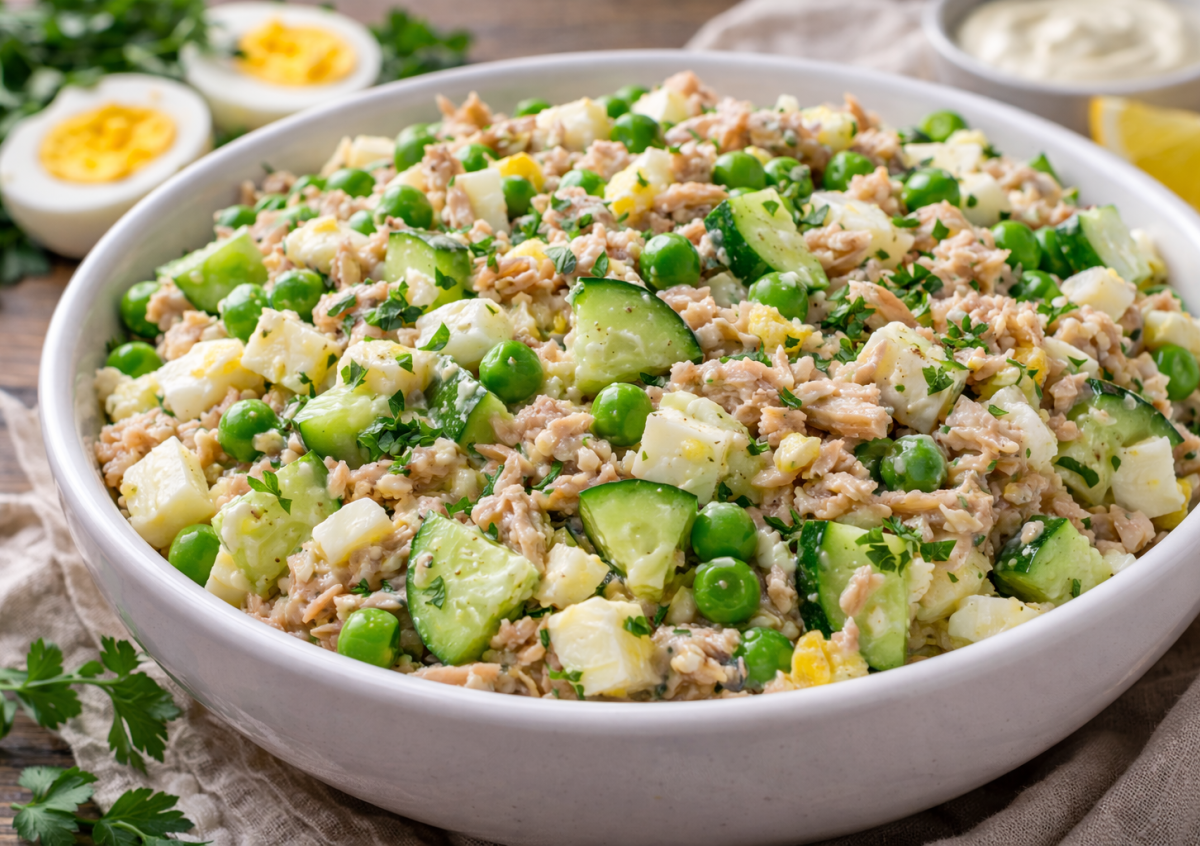 Иногда самый простой набор продуктов превращается в отличный полезный салат. Тунец дает много белка, яйца добавляют сытость, а свежий огурец и зеленый горошек делают вкус свежим и легким. Такой салат подходит для завтрака, легкого ужина или перекуса — он хорошо насыщает и не перегружает.