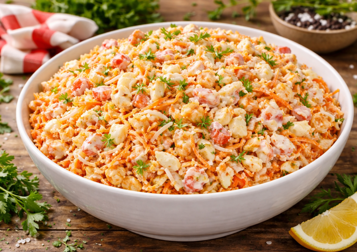 Когда гости уже на подходе, а времени на готовку почти нет, выручает именно этот салат. Он собирается за считаные минуты из простых продуктов, но выглядит и ощущается на вкус совсем не «на скорую руку». Сытный, нежный и с легкой пикантностью — идеальный вариант, когда нужно быстро накрыть на стол и не ударить в грязь лицом.