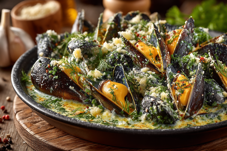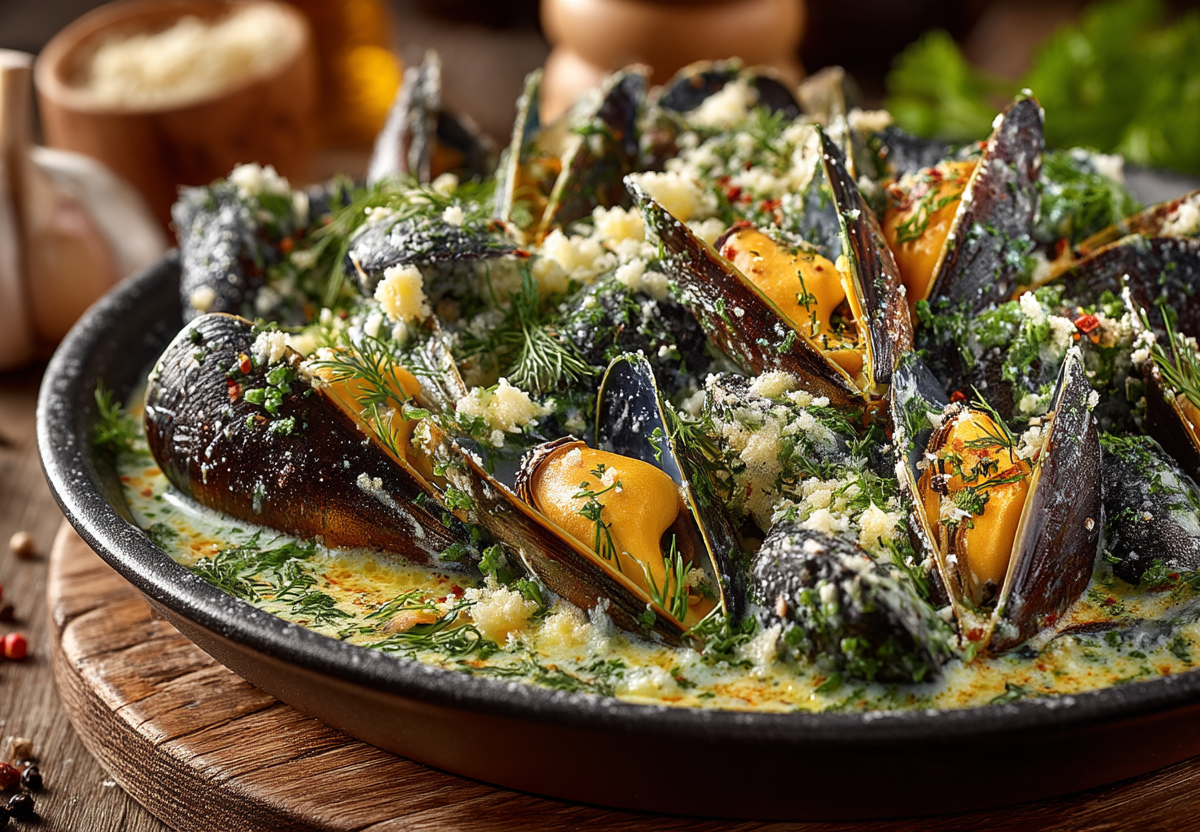 Вкус получается изысканным: сами мидии остаются мягкими и сочными, с легким привкусом моря, который идеально оттеняет чеснок и нежная сметанно-сырная заправка с пряными нотками перца.