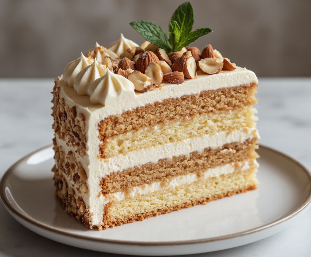 Этот торт «Серенада» с миндалем, безе и ванилью — гениально простое и невероятно нежное признание в любви, которое покоряет с первого кусочка. Его необычность в том, что хрустящие безе, рассыпчатый миндаль и воздушный ванильный крем создают ту самую симфонию вкусов, от которой невозможно оторваться. При этом никаких сложных техник — все готовится элементарно, а результат выглядит так изысканно, будто вы заказывали десерт в лучшем ресторане. Получается обалденная вкуснятина: тающие во рту слои безе, пропитанные нежнейшим кремом, с тонким ароматом ванили и благородной миндальной ноткой. Каждый кусочек — как трепетная серенада, подаренная самому родному человеку.