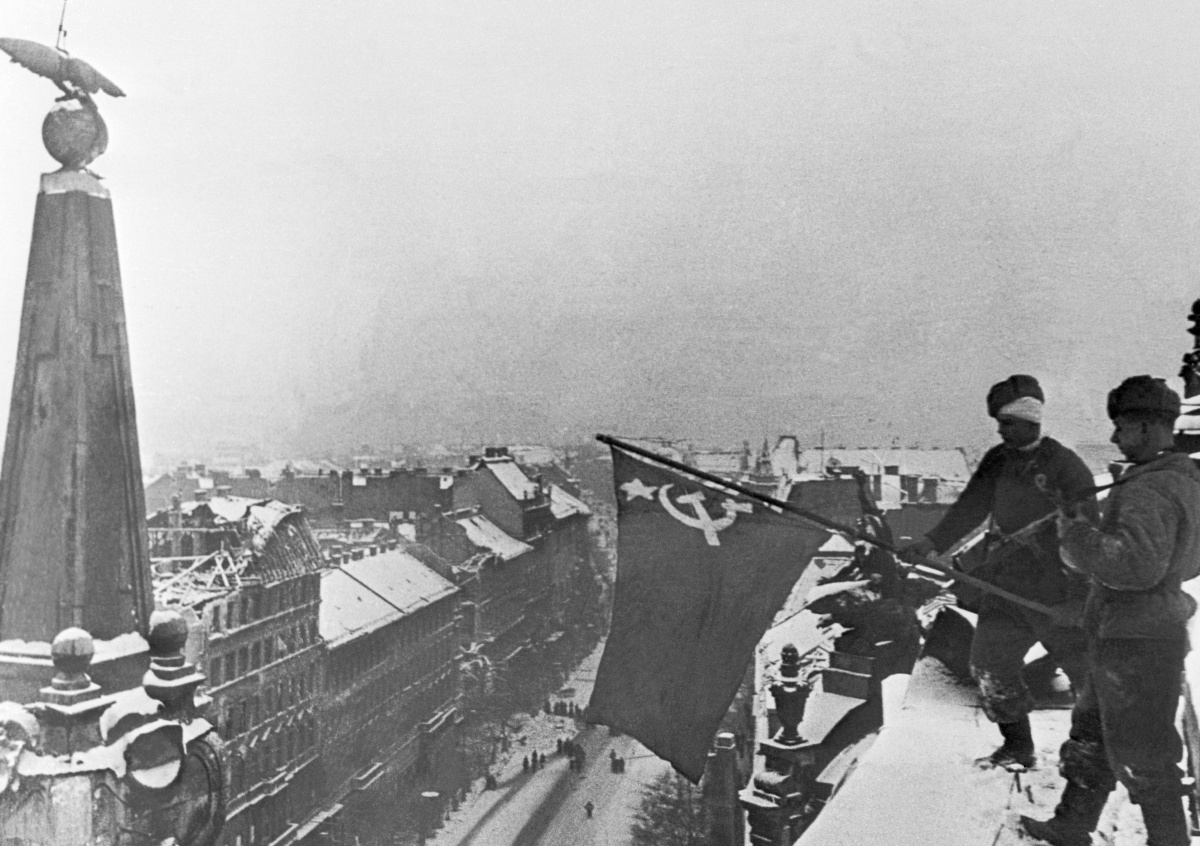 Советские солдаты водружают знамя на одном из зданий освобождённого Будапешта