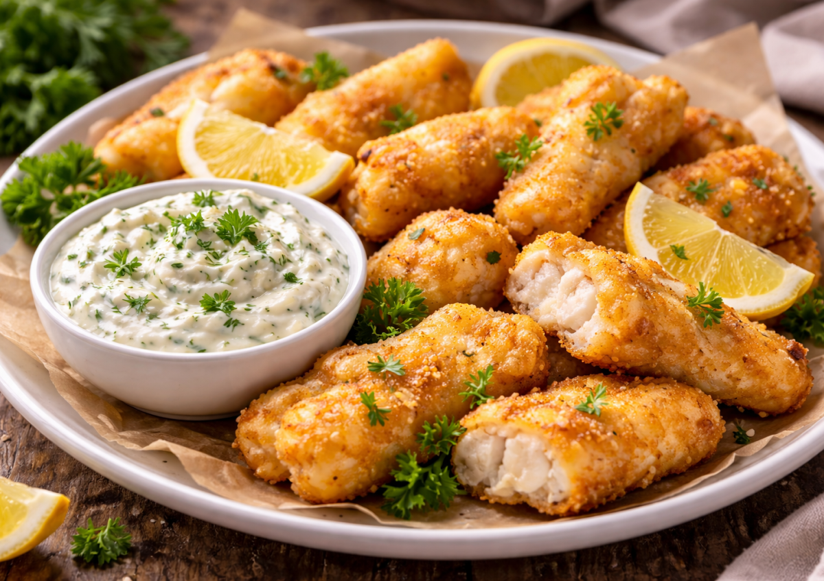 Ингредиенты: филе минтая — 500 г, мука — 3 ст. л., крахмал (картофельный или кукурузный) — 2 ст. л., молоко — 1 стакан, яичные белки — 2 шт., разрыхлитель — 0,5 ч. л., соль и черный перец — по вкусу, растительное масло — для жарки. Для соуса: плавленый сырок — 1 шт., майонез — 2 ст. л., сметана — 2 ст. л., чеснок — 1 зубчик, свежая зелень — по вкусу.
