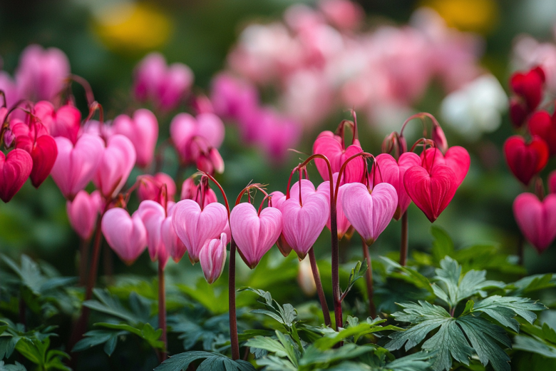 Дицентра, известная как «разбитое сердце», — это многолетник с уникальными цветами-сердечками, которые свисают с изящных дуговидных стеблей, создавая в саду атмосферу романтики и нежности.