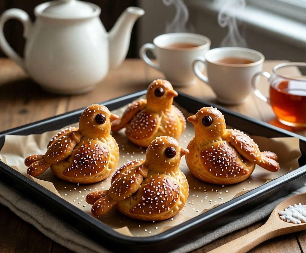 Для приготовления вам понадобится: 500 г пшеничной муки, 200 мл теплой воды, 30 г свежих дрожжей (или 10 г сухих), 3 ст. л. сахара, 1 ч. л. соли, 50 мл растительного масла, изюм для глазок и крепкий сладкий чай для смазывания. В теплой воде растворите дрожжи и сахар, добавьте половину муки, перемешайте и оставьте опару в тепле на 30 минут. Затем добавьте соль, масло, оставшуюся муку и замесите мягкое тесто. Дайте ему подойти 1–1,5 часа. Разделите тесто на жгутики, завяжите узелками, формируя птичек, вставьте глазки-изюминки. Выложите на противень, дайте расстояться 20 минут, смажьте сладким чаем и выпекайте при 190 градусах 20–25 минут до румяности.
