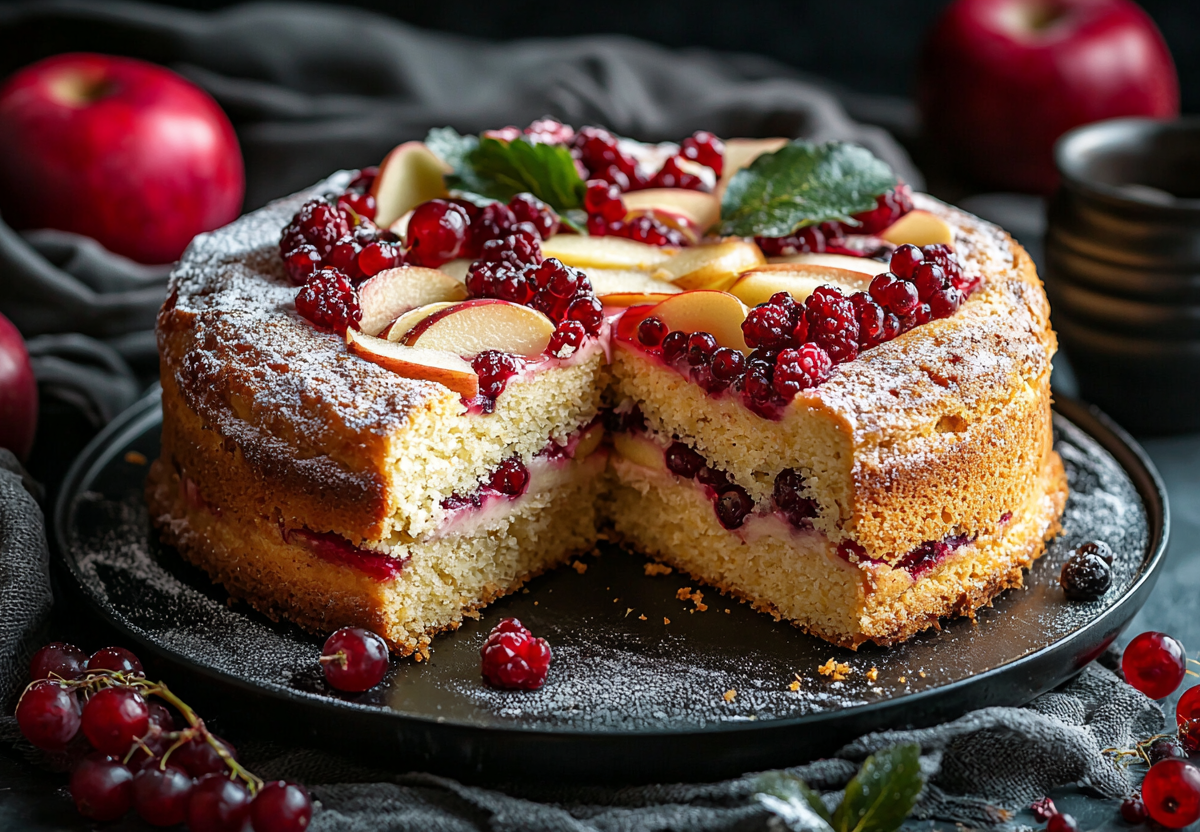 Вкус пирога бесподобен: нежный влажный бисквит с хрустящей корочкой идеально гармонирует с сочной кислинкой фруктов, создавая сбалансированный десерт. Замороженные ягоды дают больше сока, делая текстуру более влажной, а свежие фрукты сохраняют легкую упругость. Этот пирог хорош как теплым, так и остывшим.