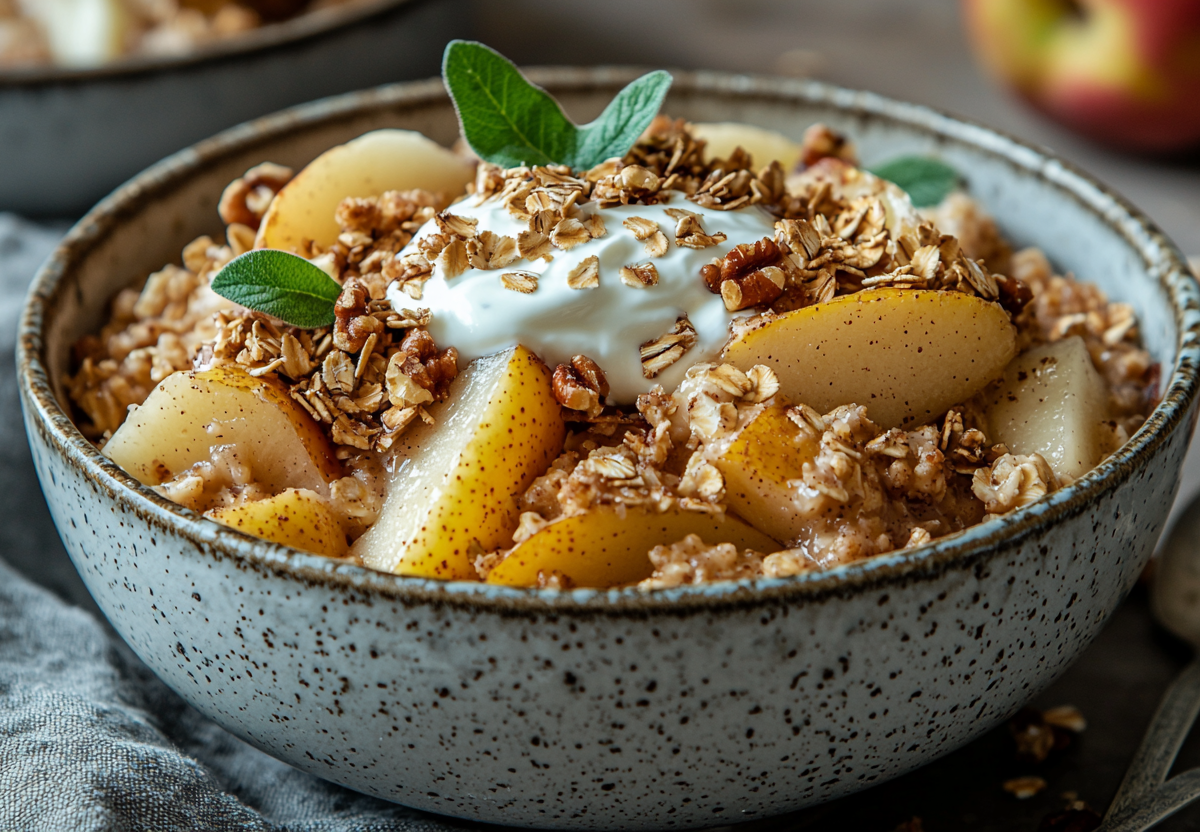Одно яблоко и одну грушу очищаю от кожуры и нарезаю небольшими кубиками. Выкладываю фрукты в жаропрочную форму, добавляю 40–60 г овсяных хлопьев, мед и корицу по вкусу, затем тщательно все перемешиваю. Отправляю форму в разогретую до 180 °C духовку на 15–20 минут, пока фрукты не станут мягкими, а овсянка сверху не подрумянится. Готовый крамбл подаю сразу, добавив сверху столовую ложку греческого йогурта и посыпав измельченными грецкими орехами (3–4 шт).