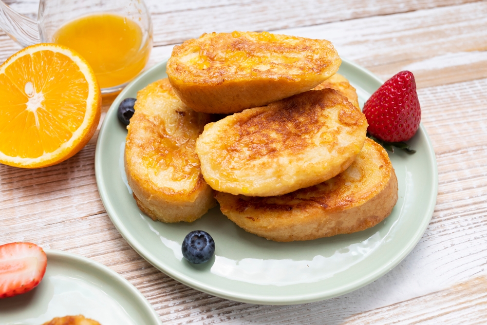 Опустите ломтик батона сначала в молоко, затем прокатите по сахару, чтобы покрыть обе стороны, и завершите процессом окунания в яйцо. Обжаривайте на сливочном масле (20 г) на среднем огне до румяной корочки с обеих сторон. Теплые гренки можно дополнить вареньем, медом или фруктами. Это простое блюдо подарит вам отличное настроение и заряд энергии на весь день!