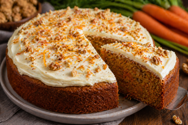 Ингредиенты: грецкие орехи — 100 г, морковь — 150 г, яйца — 2 шт., коричневый сахар — 100 г, соль — щепотка, сливочное масло (растопленное) — 60 г, корица — 1/2 ч. л., имбирь — щепотка, мускатный орех — щепотка, апельсиновая цедра — немного, мука — около 150 г, разрыхлитель — 1 ч. л., сливочный сыр — 140 г, сливки 33% — 50 мл, сахарная пудра — 2 ст. л.