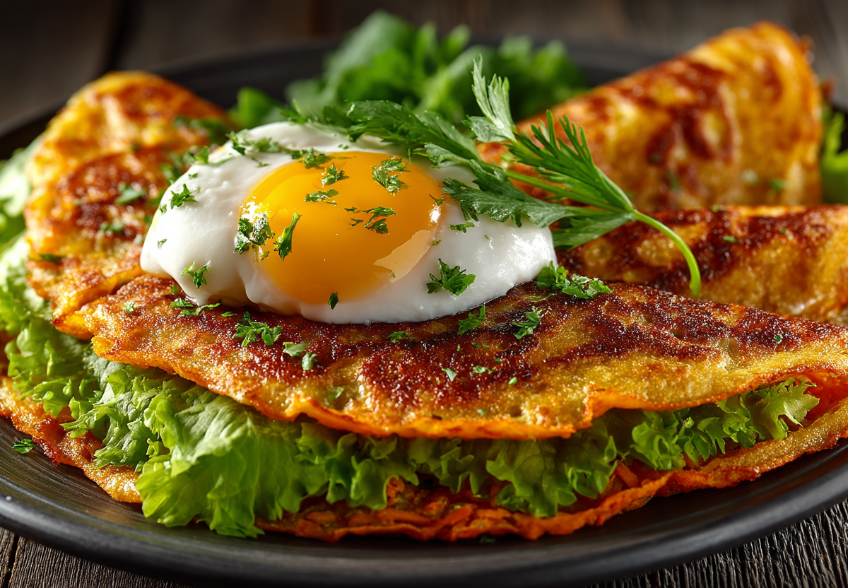 Для приготовления лепешек понадобится: крупная морковь, 100 г твердого сыра, яйцо, 1 ст. л. крахмала или муки, соль. Для наполнения: сливочный сыр, листья салата, ветчина (или что-то свое). Морковь очистите и натрите на мелкой терке. Сыр натрите на крупной терке. В миске смешайте морковь, сыр, яйцо, крахмал, соль. Перемешайте. Разогрейте духовку до 180 °C. Противень застелите пергаментом и слегка смажьте маслом, выложите на него морковную массу, формируя круглые лепешки толщиной около 0,5 см. Выпекайте 15–20 минут. Для подачи смажьте каждую теплую лепешку сливочным сыром, уложите лист салата, ветчину или другую начинку и аккуратно сверните пополам. Ешьте сразу.