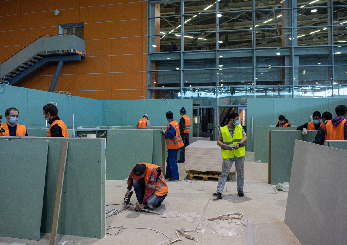 Бирюков отметил, что к возведению госпиталей привлечены работники, освободившиеся из-за приостановки деятельности в других отраслях. Также заммэра сообщил, что в строительстве участвуют специалисты из проектных институтов. Так Бирюков ответил на вопрос, каким образом московские власти смогли привлечь на строительные объекты такое количество людей за короткий срок.