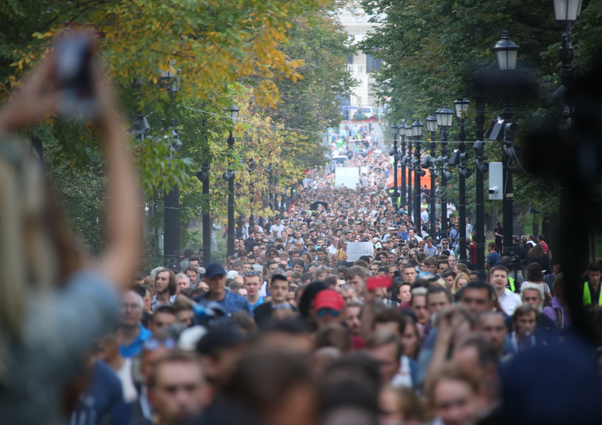 Несогласованный митинг в поддержку кандидатов в Мосгордуму, которым власти отказали в регистрации, начался в Москве.