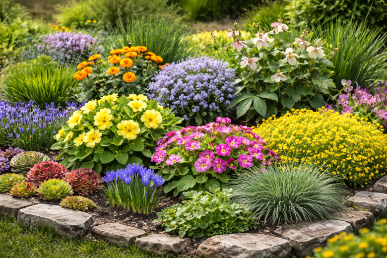 Примула — один из самых ранних и надежных вариантов. Это многолетник, который зацветает практически сразу после схода снега и спокойно переносит похолодания до −5−7 °C. При этом растение сохраняет декоративность и не требует укрытия. Главное условие — избегать застоя воды.
