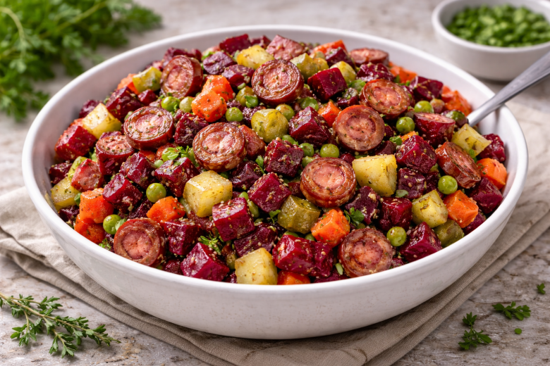 Этот салат напоминает классический винегрет, но вкус у него намного ярче. Мужская версия с охотничьими колбасками: они дают аромат дымка и делают блюдо по-настоящему сытным. А маринованные огурцы добавляют приятную кислинку — получается идеальный вариант и на ужин, и на праздничный стол.