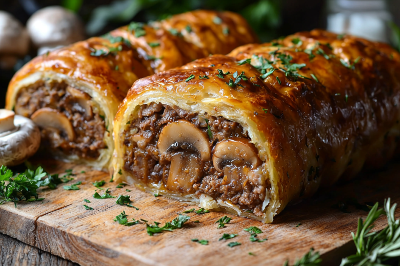 Как приготовить: фарш посолите по вкусу. Шампиньоны нарежьте пластинками, лук — мелкими кубиками. Обжарьте грибы с луком до золотистого цвета, слегка посолив. Яйца отварите вкрутую (7–8 минут), очистите и нарежьте крупными кусочками. Раскатайте слоёное тесто в прямоугольный пласт средней толщины. Равномерно посыпьте его тёртым сыром. Сверху распределите слой фарша, затем выложите обжаренные грибы с луком и кусочки яиц. Аккуратно, но плотно сверните тесто в рулет, защипнув края. Переверните рулет швом вниз на противень, застеленный пергаментом. Смажьте поверхность взбитым желтком и сделайте несколько небольших надрезов для выхода пара. Выпекайте в разогретой до 180 °C духовке около 50 минут до красивой золотистой корочки.