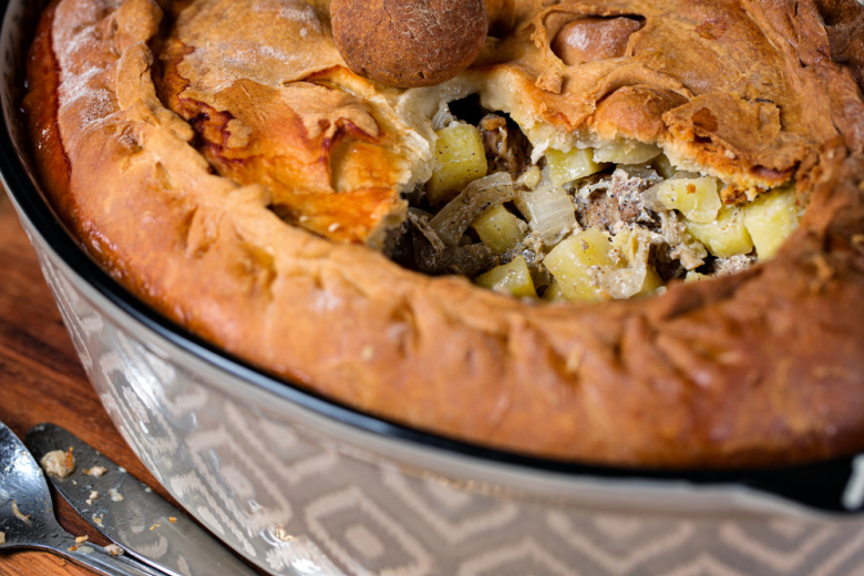 Для теста понадобятся: 500 мл кефира, 2 яйца, 1 ч. л. соли, 1 ч. л. сахара, 1 ч. л. соды, мука (около 600-700 г до мягкого, но плотного теста). Для начинки: 1 кг говяжьей лопатки или шеи, нарезанной небольшими кубиками (1-1,5 см), 6 средних картофелин, нарезанных чуть мельче мяса, 3 крупные луковицы, мелко нарезанные, соль, черный перец, 100 г холодного сливочного масла.