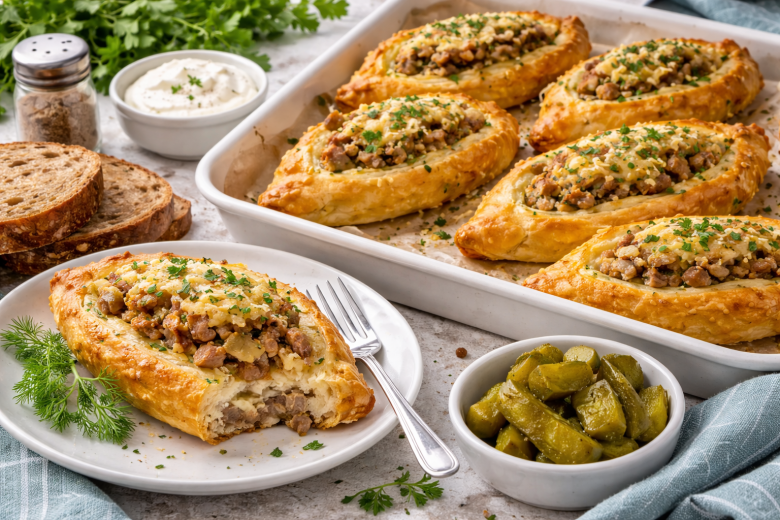 Этот рецепт — настоящая находка для тех, кто любит готовить сытно, красиво и без лишней суеты. В одной порции здесь есть все: нежное мясо, картофельное пюре, пикантные огурчики и хрустящее слоеное тесто. Получается полноценный ужин, который не требует дополнительных гарниров. Ароматные лодочки выглядят эффектно, готовятся просто и отлично подходят как для семейного ужина, так и для гостей.