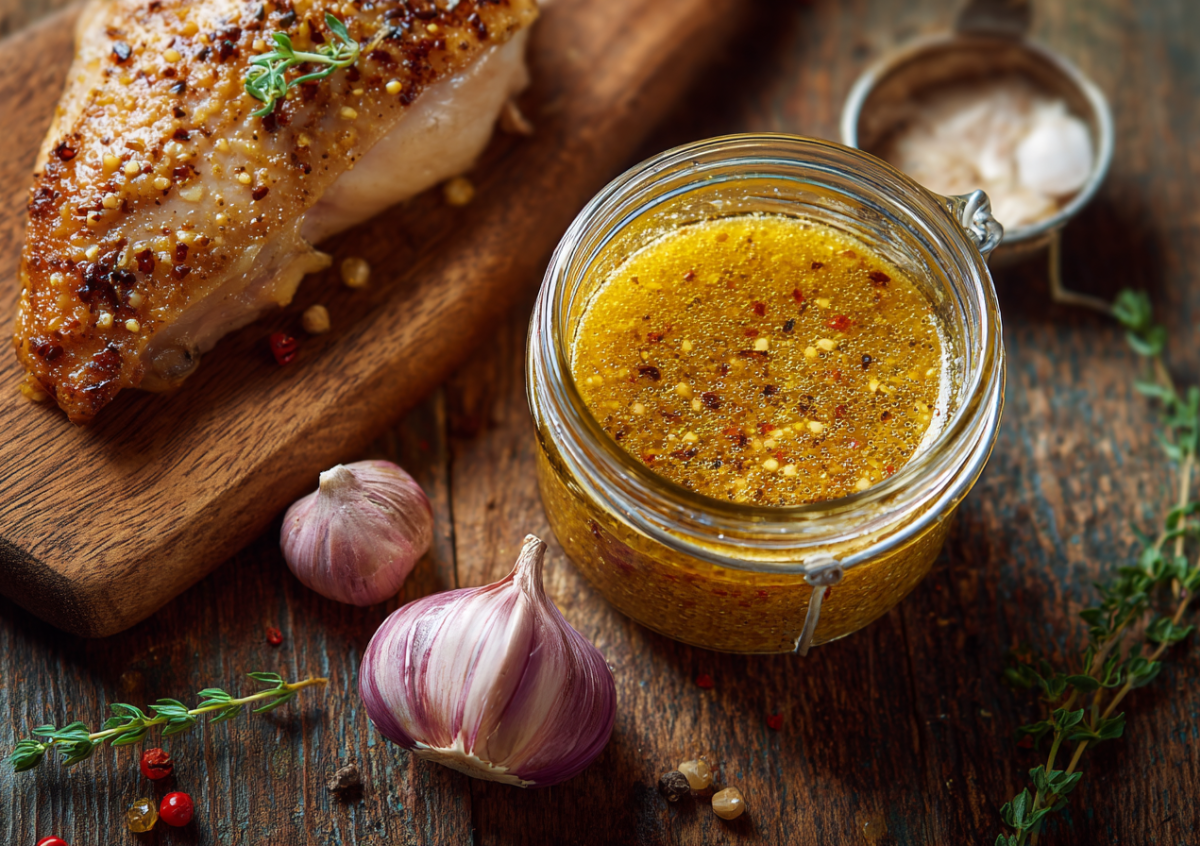 Нам понадобятся: 3 ст. л. зернистой горчицы, 2 ст. л. жидкого меда, 2 ст. л. соуса терияки (или соевого), 3 зубчика чеснока, 1 ст. л. масла виноградной косточки, 1 ч. л. копченой паприки, сок 1/2 лайма, морская соль и свежемолотый перец по вкусу. Также подготовьте сушеный тимьян — щепотку.