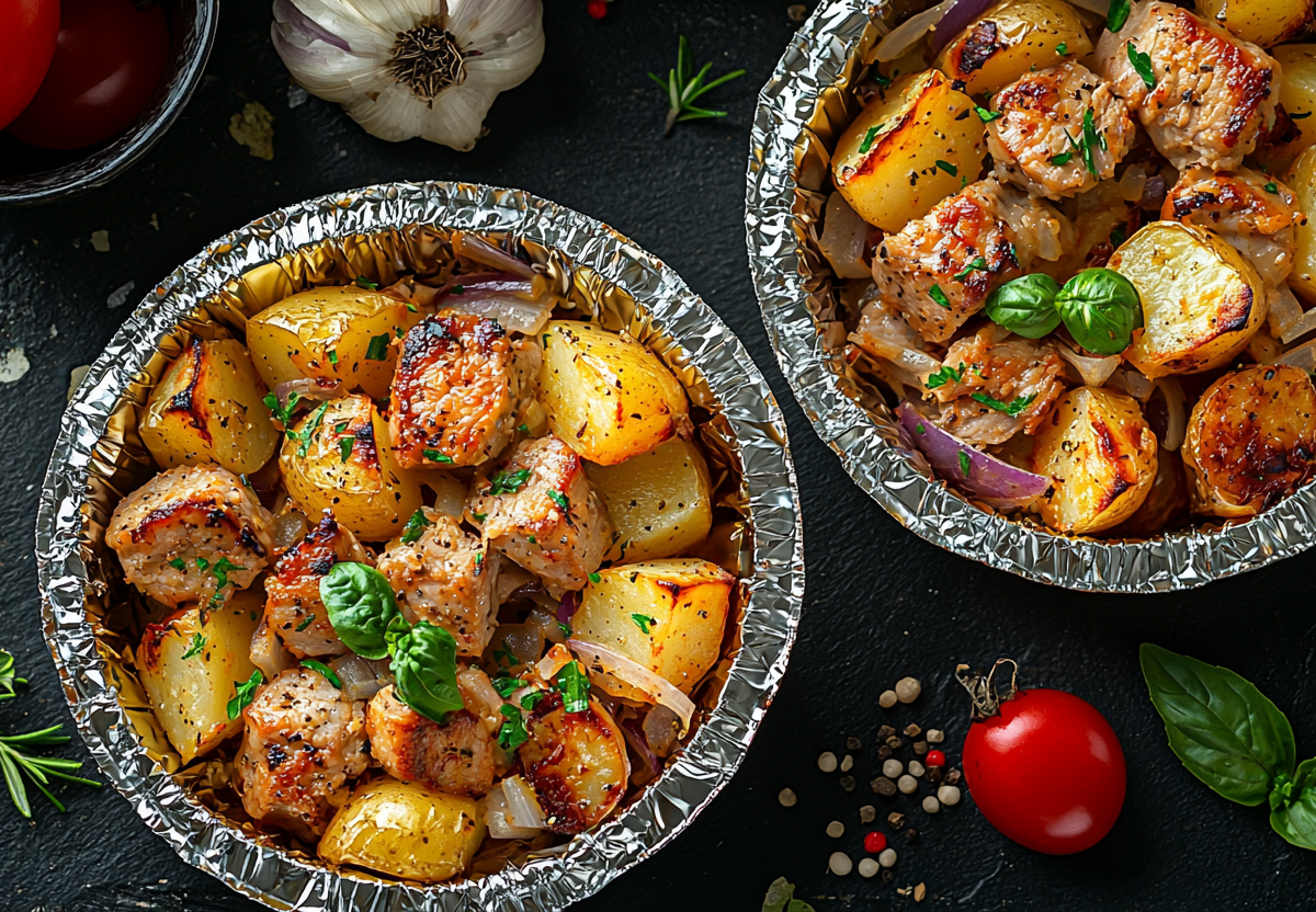 Мясо с овощами в тарелках из фольги — сочный ужин без хлопот! Этот рецепт — настоящее спасение, когда хочется вкусно поесть, но не хочется мыть гору посуды. Ароматное мясо, нежные овощи и расплавленный сыр — все запекается вместе и получается невероятно вкусным!