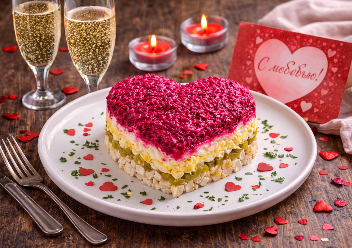 Этот салат в форме сердца — идеальный вариант для романтического ужина. Он получается нежным, сытным и очень красивым. Такое блюдо станет настоящим признанием в любви на праздничном столе. Готовится из доступных ингредиентов, а выглядит эффектно и по-настоящему празднично.