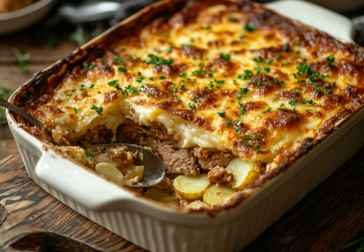 Запеканка из свинины и картофеля в сметане — это сытное блюдо с золотистой корочкой, где нежное мясо гармонично сочетается с тающим во рту картофелем под сливочным сметанным соусом.