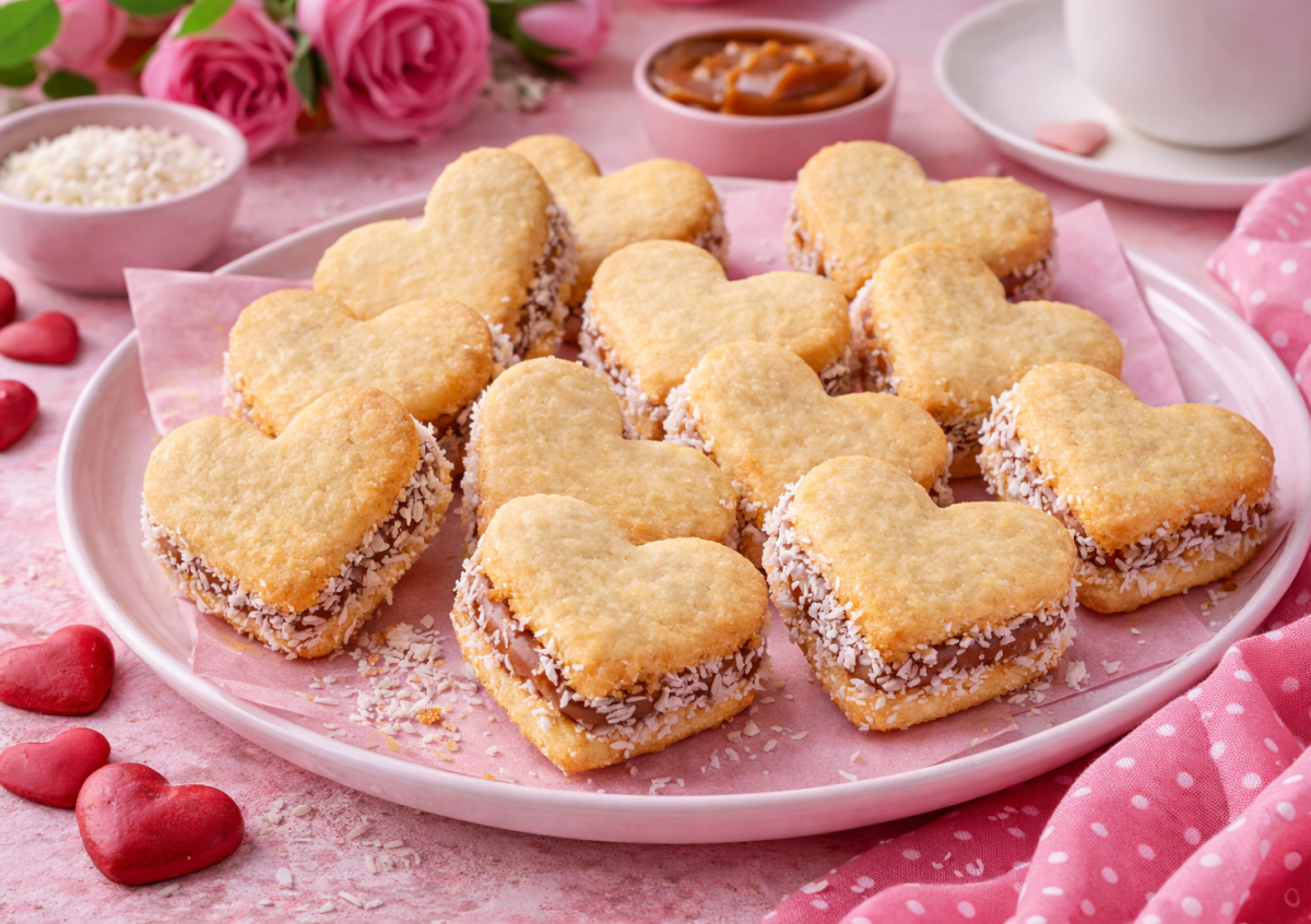 Приготовление: размягченное масло взбейте с желтками до пышной массы. Добавьте сахар, соль и ванилин, перемешайте. Влейте горячее молоко тонкой струйкой, продолжая взбивать. Вмешайте крахмал, разрыхлитель и просеянную муку, замесите мягкое тесто. Раскатайте тесто толщиной около 5 мм и вырежьте сердечки формочкой. Выложите заготовки на противень с пергаментом и выпекайте при 180°C около 10 минут до легкой румяности. Остывшее печенье смажьте вареной сгущенкой, соедините попарно. Края обмакните в кокосовую стружку.