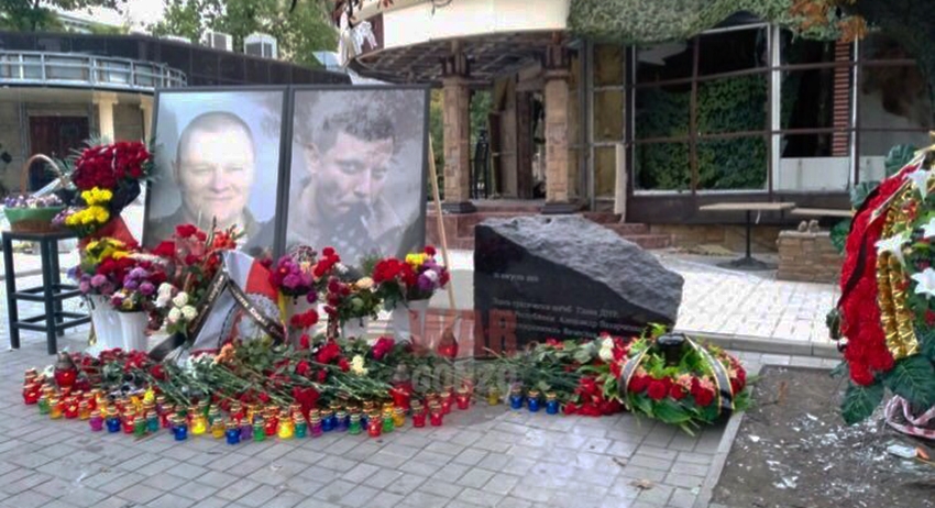 На табличке написано: «Здесь трагически погиб глава ДНР, герой Александр Захарченко и его телохранитель Вячеслав Доценко». Рядом с мемориалом стоят два огромных портрета погибших.