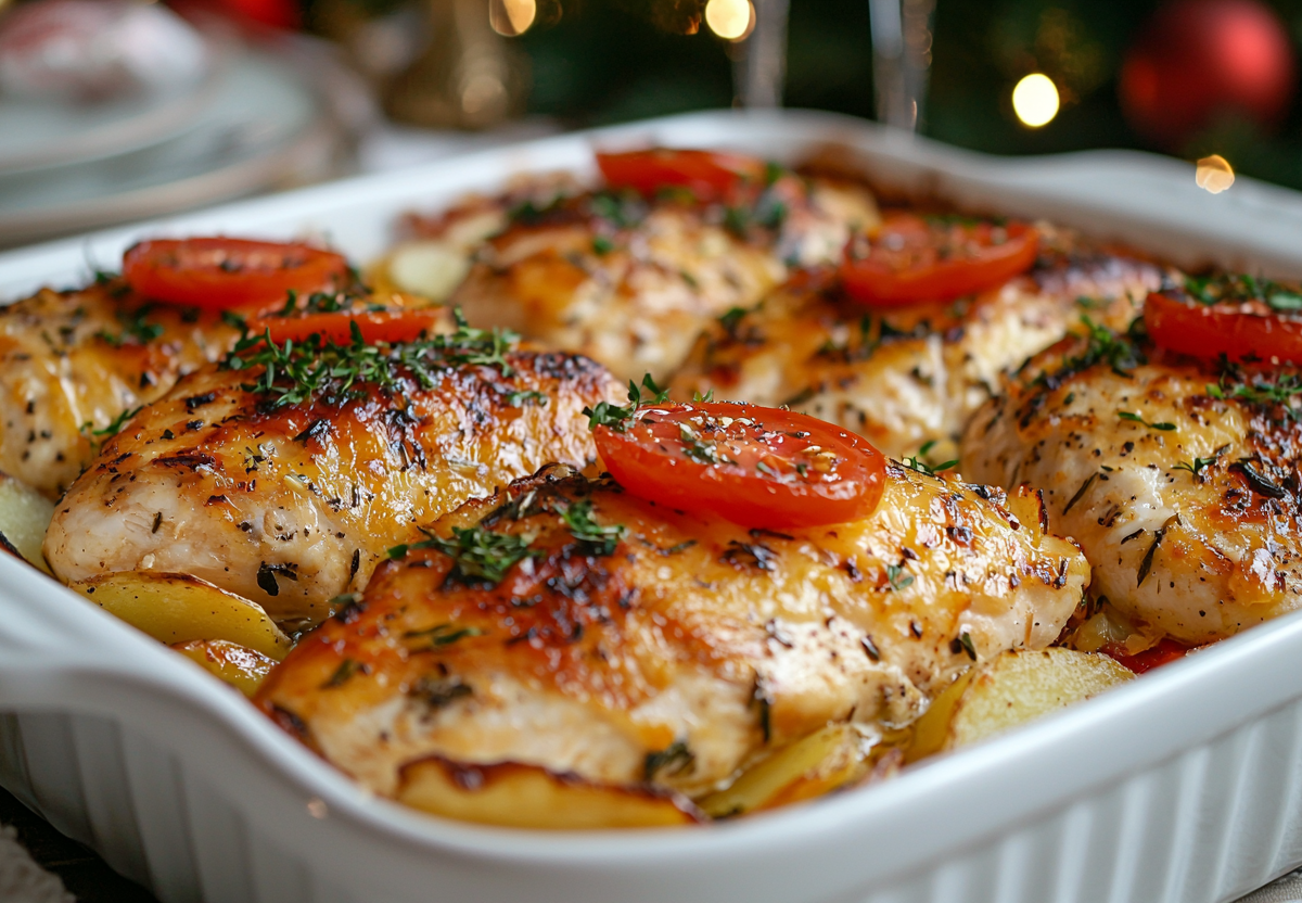 Вам понадобится: 1,5 кг картофеля, 800 г куриной грудки, 2 крупные луковицы, 2–3 помидора, 300 г сметаны, 200 г твердого сыра, растительное масло, соль, перец, специи для курицы. Духовку разогрейте до 200°C. Противень смажьте маслом. Выложите первый слой — нарезанный на кружочки картофель, посолите и поперчите. Вторым слоем распределите пластины курицы, посолите и посыпьте специями. Третьим слоем выложите нарезанный полукольцами лук. Обильно смажьте всю поверхность сметаной. Четвертый слой — кружочки помидоров. Последним слоем обильно посыпьте все тертым сыром. Запекайте 40–50 минут до готовности картофеля и красивой золотистой сырной корочки.