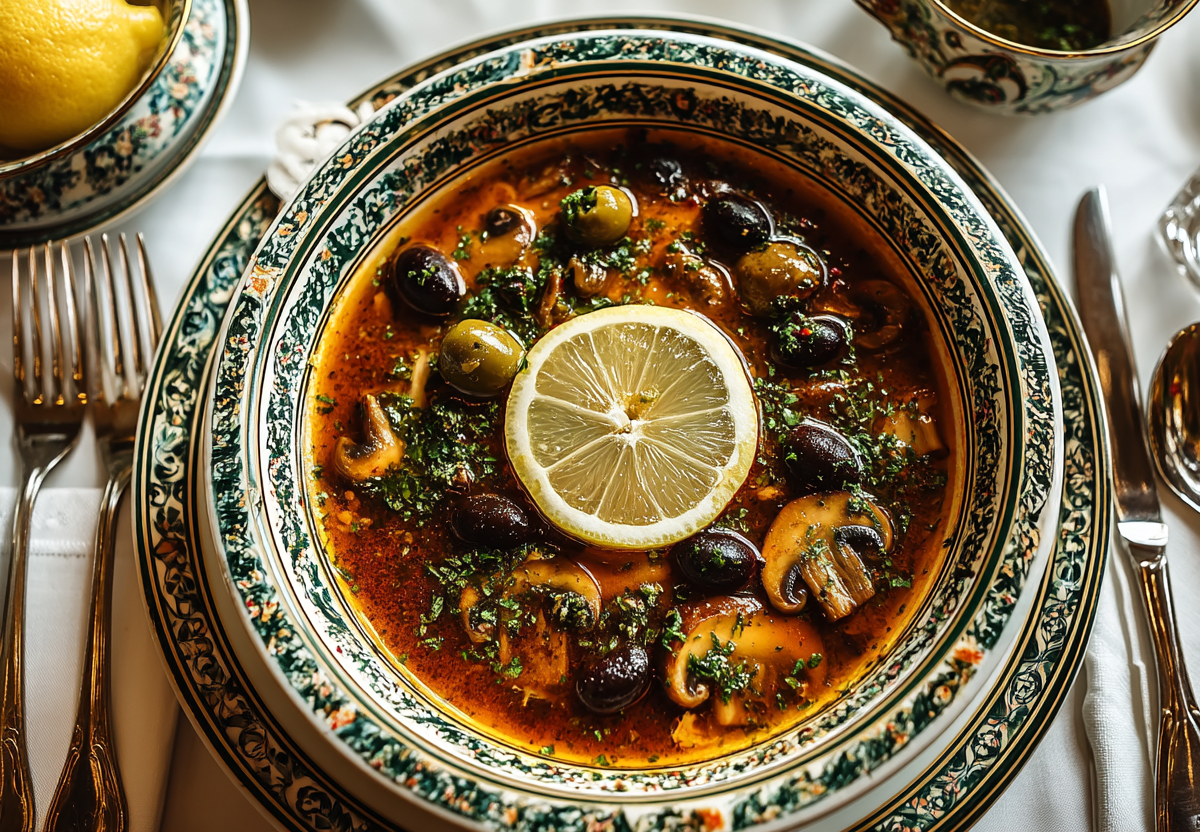 Способ приготовления: грибы нарежьте пластинками, лук — кубиками, морковь — соломкой, картофель — брусочками, огурцы — мелкими кубиками. В кастрюле разогрейте масло, обжарьте лук до прозрачности, добавьте морковь и грибы, жарьте 7-10 минут. Добавьте томатную пасту, перемешайте и прогрейте 2 минуты. Влейте 1,5-2 литра горячей воды, доведите до кипения. Добавьте картофель, варите 10 минут. Затем добавьте огурцы, маслины, лавровый лист, соль и перец. Варите еще 10 минут до готовности картофеля. В конце влейте лимонный сок и добавьте рубленую зелень. Дайте настояться под крышкой 15-20 минут.
