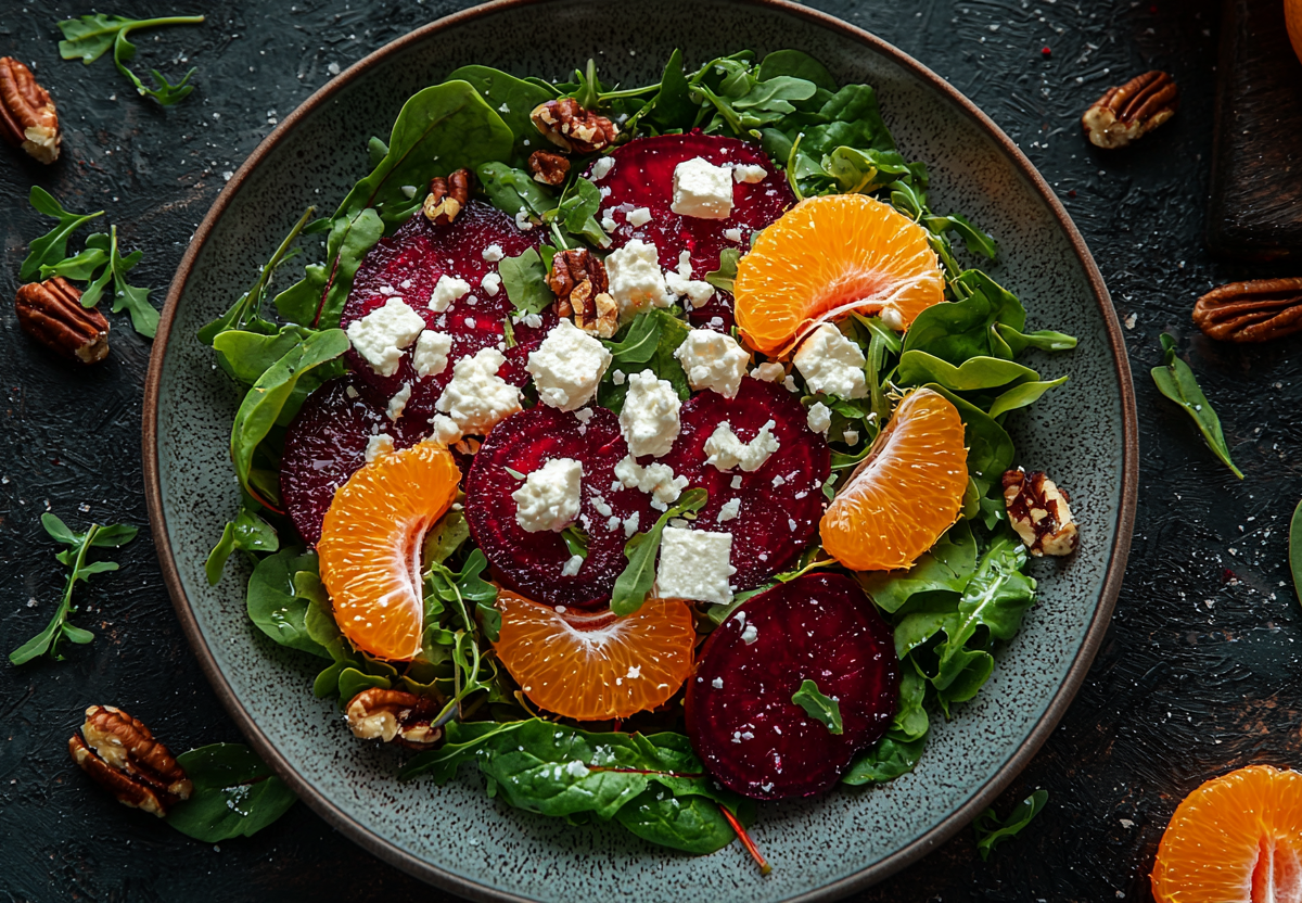 Основой стала зеленая смесь: листья салата, рукола или шпинат — около 150 г. На нее разложили кружочки 2 вареных свекол, которые добавили сладость и насыщенный цвет. Свежие цитрусовые ноты внесли 2 мандарина, очищенные и разобранные на дольки. Нежная солоноватая фета (100 г) прекрасно собрала вкусы, а горсть орехов пекан добавила праздничный хруст.
