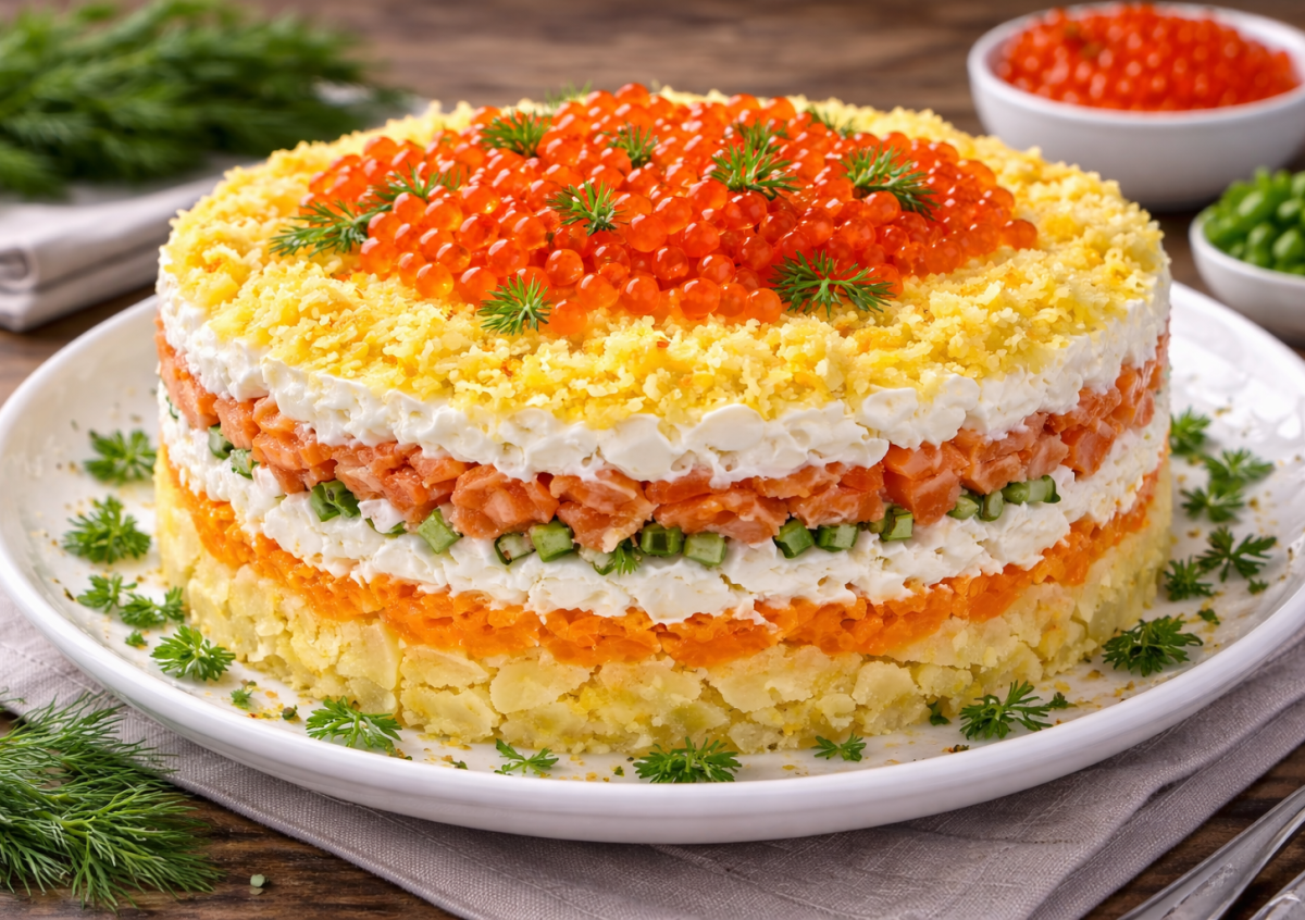 «Лакшери-мимоза» — тот самый случай, когда привычная «Мимоза» превращается в настоящее праздничное блюдо. Слабосоленая форель, нежные слои овощей и воздушная яичная шапка делают его эффектным и по-настоящему торжественным. Такой вариант смело можно ставить в центр стола — выглядит дорого и запоминается надолго.