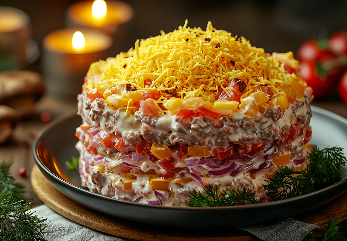 Вам понадобится: 400 г отварной говядины или свинины, 1 крупная луковица, 300 г шампиньонов, 2 помидора, 200 г твердого сыра. Для заправки: майонез смешать с 2-3 зубчиками продавленного чеснока. Мясо нарежьте тонкой соломкой. Луковицу нарежьте полукольцами и замаринуйте на 15 минут в смеси уксуса, воды и сахара. Шампиньоны нарежьте и обжарьте до готовности, сыр натрите, помидоры нарежьте кубиком. Салат собираем слоями, промазывая каждый чесночным майонезом. Первый слой: отварное мясо. Второй слой: маринованный лук. Третий слой: обжаренные и остывшие грибы. Четвертый слой: помидор. Пятый, завершающий слой: обильно посыпаем тертым сыром. Даем салату настояться в холодильнике 2–3 часа.