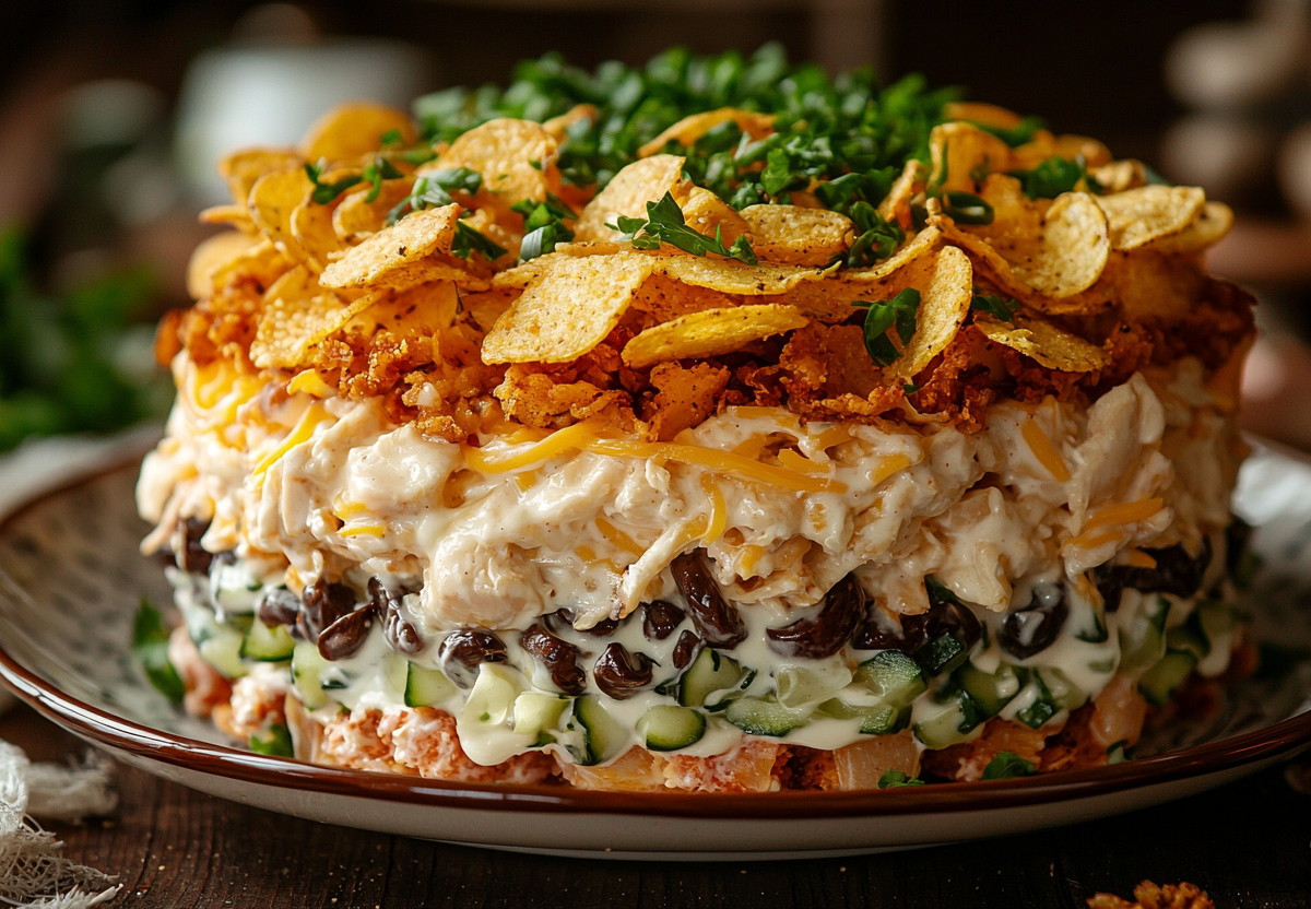 Это идеальный баланс сочной курицы, пикантных грибов, солоноватого сыра и маринованного огурца, которые связывает нежный майонез. А главная изюминка — контраст нежной массы и хрустящей крошки чипсов, рассыпающейся во рту.
