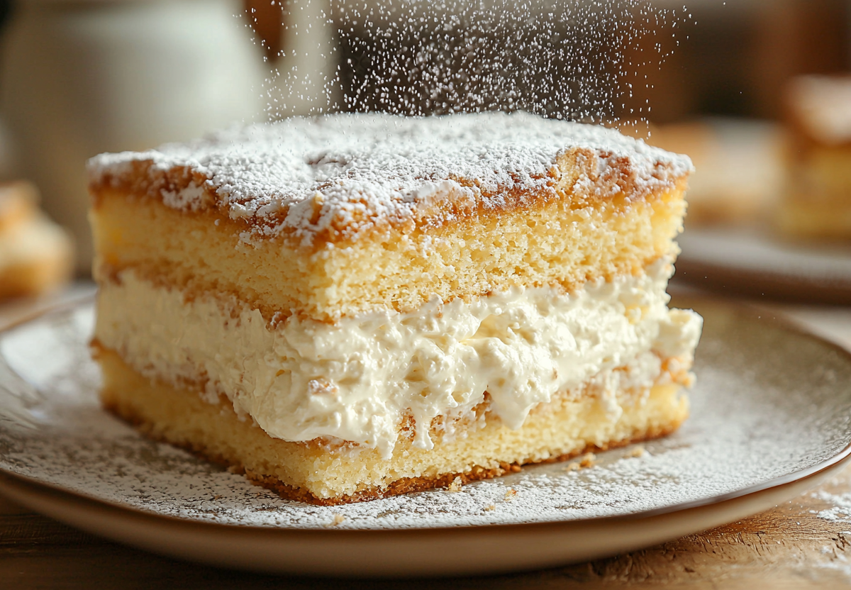 Вкус получается потрясающим: два слоя влажного, слегка пористого и сладковатого теста обрамляют сочную, кремовую прослойку из творога с легкой кислинкой. От него не оторваться!