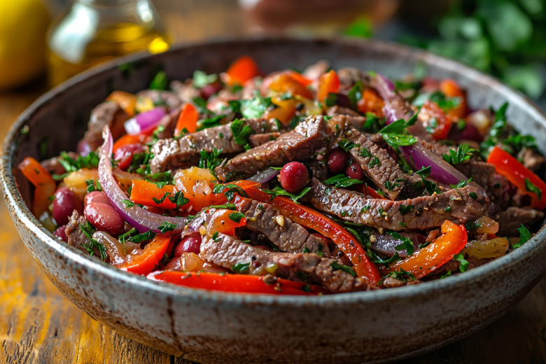 Надоела майонезная жижа? Готовим обалденный салат с говядиной и фасолью: заправка из маринованного лука делает его вкуснейшим и легким. Это блюдо — настоящая гастрономическая находка! Сочная говядина, нежная фасоль, сладкий красный перец и ароматные специи создают неповторимый вкусовой букет. Салат выглядит празднично, готовится просто, а главное — он гораздо полезнее привычных майонезных вариантов.