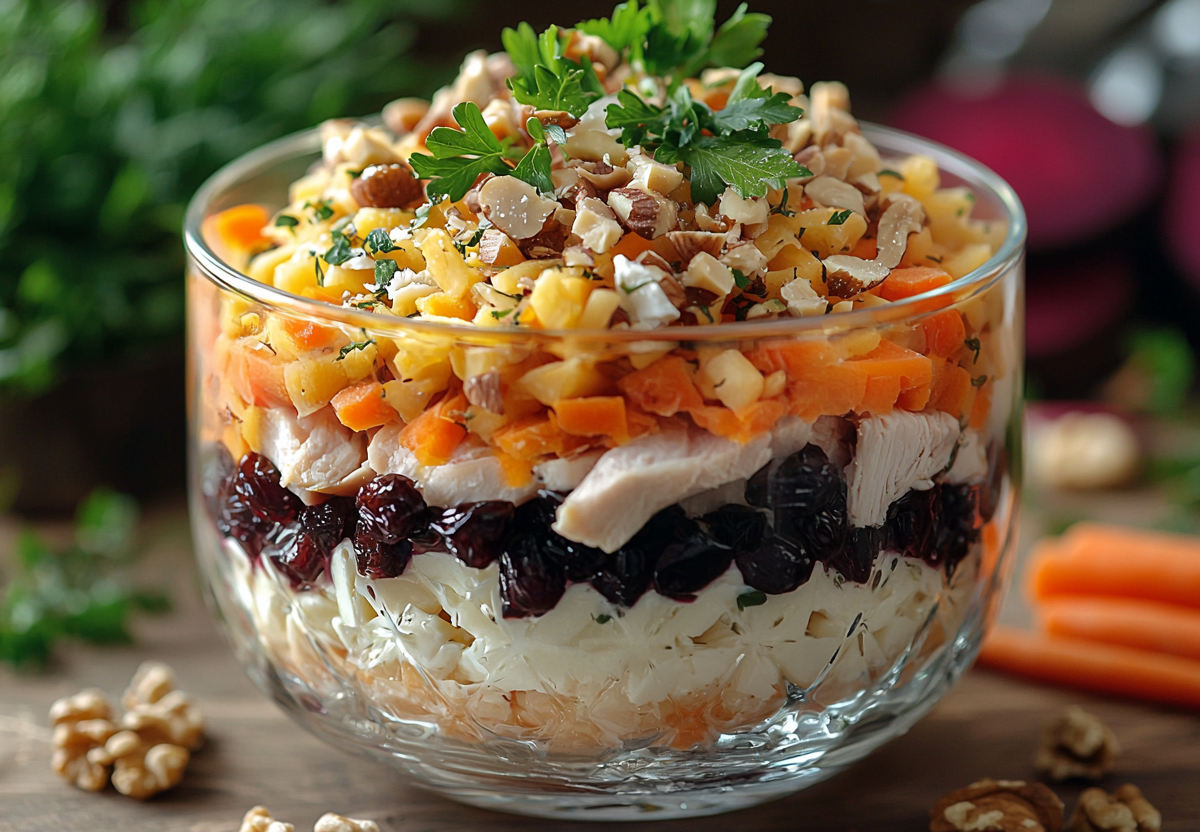 Салат «Чингисхан» — это тот самый случай, когда простое сочетание знакомых ингредиентов рождает настоящий кулинарный спектакль. В ресторанах он часто возглавляет список закусок не только из-за великолепного вкуса, но и благодаря эффектной подаче. Однако его секрет вовсе не в сложной технике, а в гармонии сладковатых овощей, пикантного мяса, ореховой крошки и аромата копченого чернослива. Приготовив этот салат дома, вы не только сэкономите значительную сумму, но и сможете регулировать насыщенность вкуса по своему усмотрению. Это блюдо станет гвоздем программы любого застолья — сытное, яркое и с характером, оно гарантированно исчезнет со стола первым.
