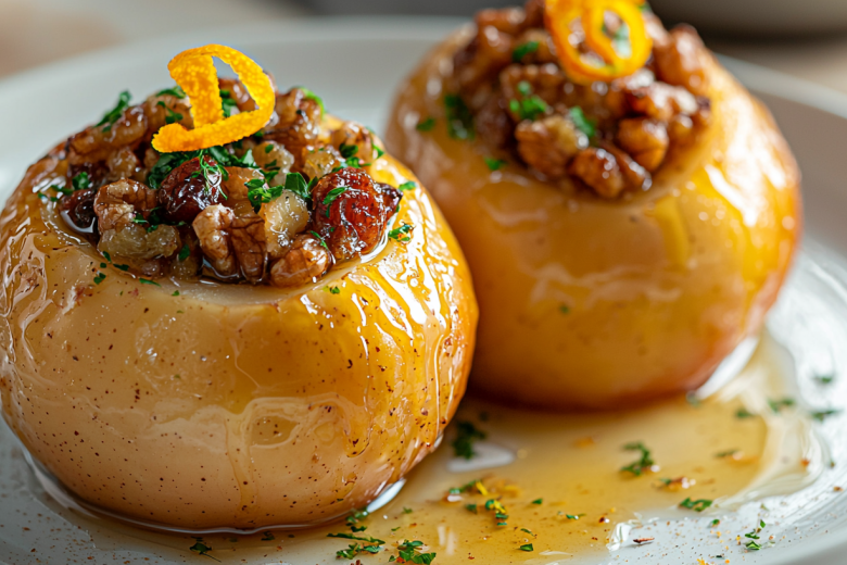 Яблоки (2 шт., лучше твердых сортов) тщательно мою. Осторожно срезаю верхнюю часть с хвостиком — это будет крышечка. С помощью ножа или специального инструмента вырезаю сердцевину с семенами, оставляя стенки и дно толщиной примерно 0,5–1 см, чтобы яблоко не развалилось. Грецкие орехи (30 г) и изюм (30 г) мелко рублю ножом и смешиваю. Этой орехово-фруктовой смесью наполняю подготовленные яблоки почти до верха. Накрываю яблоки срезанными верхушками и ставлю в жаропрочную форму. Отправляю в разогретую до 180°C духовку на 20–25 минут, пока яблоки не станут мягкими, но не потеряют форму. Пока яблоки запекаются, готовлю соус: в пиале смешиваю густой турецкий или греческий йогурт (50 мл), жидкий мед (15 г), мелко натертую цедру одного апельсина (примерно 1 г) и свежевыжатый сок лимона (5 мл). Тщательно взбиваю вилкой до однородности и оставляю настояться. Готовые запеченные яблоки аккуратно вынимаю из формы, снимаю крышечки и обильно поливаю сверху подготовленным йогуртово-цитрусовым соусом. Подаю теплыми.