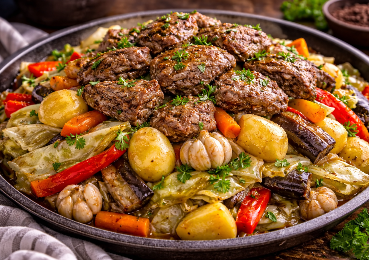 Приготовление: на дно казана выкладываю крупно нарезанное мясо, жирные куски — к стенкам, косточки — вниз. Солю и щедро посыпаю зирой. Сверху укладываю нарезанный кольцами лук, затем помидоры и снова немного соли. Далее идут крупные куски моркови и картофель — целиком или половинками. Следующим слоем отправляю остальные овощи и целые головки чеснока. Зелень кладу ветками — для аромата. Все слегка солю и приправляю. Сверху — крупно нарезанная капуста, предварительно слегка перетертая с солью и зирой. Накрываю все цельными капустными листьями. Казан плотно закрываю крышкой и ставлю на средний огонь. Как только внутри закипит, убавляю нагрев и томлю около часа. После выключения даю постоять еще 15 минут, не открывая крышку. При подаче слои переворачиваю — мясо оказывается сверху.