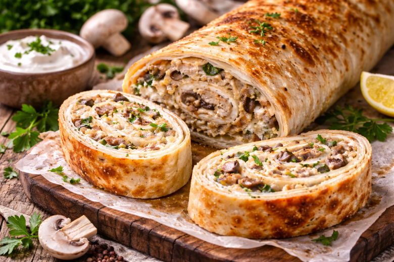 Этот рулет стане спасением, когда хочется вкусно поесть и не перегружать себя калориями. Готовится за считанные минуты, получается сочным, сытным и очень ароматным. Домашние всегда будут просить добавку. Нежный куриный фарш, сливочный йогурт, тянущийся сыр и сочные грибы в тонком лаваше превращаются в настоящий белковый ужин, который не вредит фигуре и отлично насыщает.