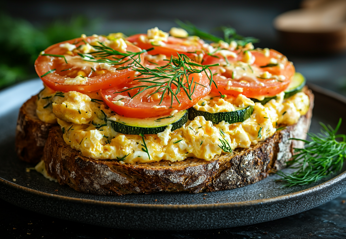 Намазка с жареными кабачками для бутербродов! Идеальный вариант для быстрого завтрака или лёгкого перекуса — нежная пикантная намазка с жареными кабачками, яйцами и сыром. Она сочетает в себе насыщенный вкус и приятную текстуру, а свежие помидоры добавляют сочности.