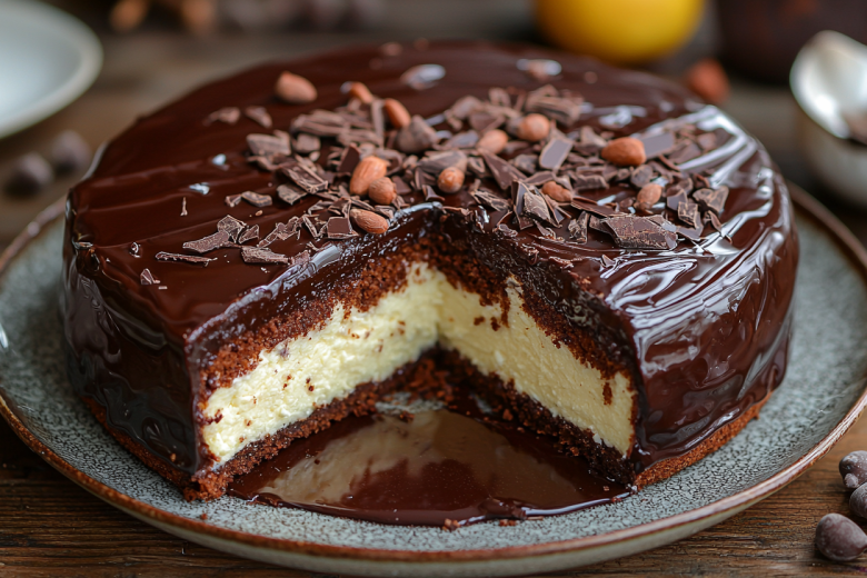 Для теста взбейте 170 г размягченного сливочного масла с 100 г сахара. Добавьте 3 яйца по одному, затем 800 г протертого творога, 280 г муки, 40 г крахмала и щепотку ванилина. Тесто выложите в форму диаметром 24 см и выпекайте при 180°C 40-45 минут. Для глазури растопите 230 г черного шоколада со 200 г сливок и 1 г коньяка. Готовый остывший корж разрежьте вдоль, пропитайте сметаной, смешанной с оставшимся сахаром, и покройте шоколадной глазурью. Дайте торту пропитаться 2-3 часа в холодильнике. Нежный творожный вкус в сочетании с благородной горчинкой шоколада сделает ваш новогодний вечер по-настоящему волшебным!