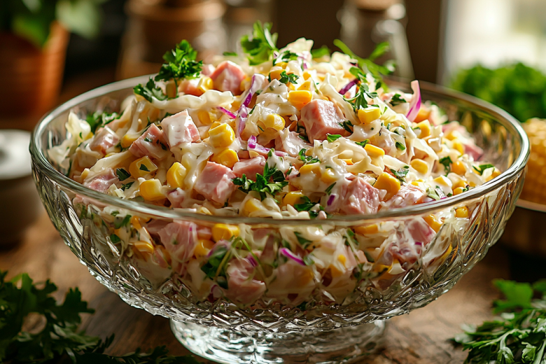 Вкус этого салата — это идеальный баланс хрустящей свежести и пикантной насыщенности: нежная капуста создает освежающую основу, ветчина добавляет солоноватые мясные нотки, сладковатая кукуруза дарит легкую сладость, а сметанно-горчичная заправка объединяет все компоненты, добавляя приятную остринку и кремовую текстуру. Салат получается легким, но при этом достаточно сытным.