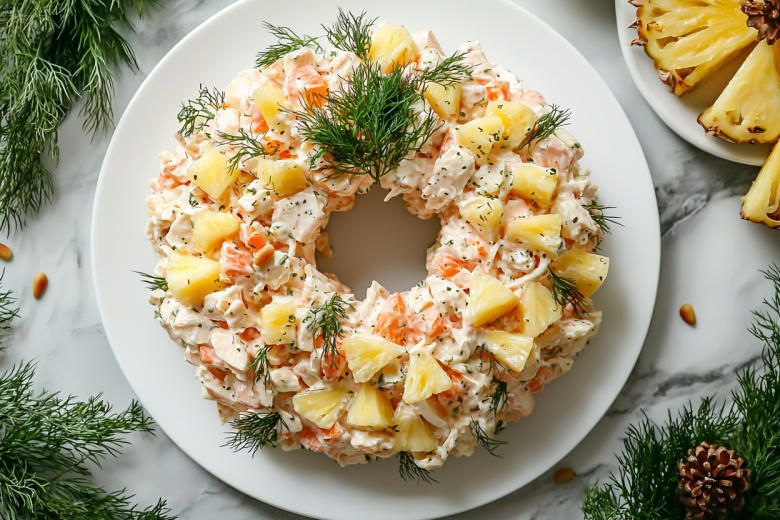 Настолько просто, что готовится быстрее, чем накрывается на стол. Салат-кольцо с курицей и ананасом. Любимая классика по-немецки