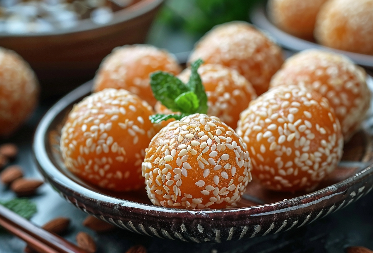 В блендере измельчить 12 фиников без косточек, 1 ч. л. ложку тертого имбиря, 100 г очищенного миндаля, добавить сок ½ лимона, 1 ч. л. корицы, 1 ч. л. подсолнечного масла и 2 ст. л. воды. С помощью чайной ложки сформировать шарики, панировать их в семенах белого кунжута и отправить в морозилку.