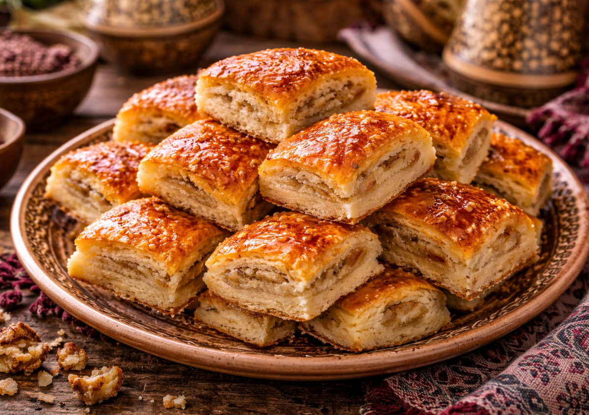 Подошедшее тесто раскатайте в пласт, смажьте половиной начинки и сложите пополам. Снова раскатайте и повторите процесс для получения слоистой структуры. Затем раскатайте пласт толщиной около 1 см, нарежьте квадратами и плотно выложите на противень. Смажьте смесью желтка и молока. Выпекайте при 190 °C примерно 20–25 минут до красивого золотистого цвета. Готовый назук можно смазать медом — для аппетитного блеска и дополнительной нежной сладости.